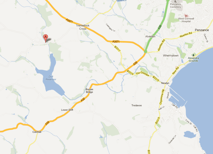Follow the A30 towards Penzance. At the end of the dual carriageway (Tesco’s) do not go into Penzance town, but stay on the A30, up the hill, heading towards Lands End. Go straight across at the 1st and 2nd roundabouts. At the third roundabout, turn right taking the A3071 to St. Just. About a mile along this road you will come to a crossroads which is called Tremethick Cross. Slow down, and take the left hand turn towards Sancreed. The cottage is about a mile up this road. The road will start to go down a hill, and then over a bridge at the bottom (Skimmel Bridge itself). The road will then turn slightly towards the right and go back up the hill again. You may (depending on the season) be able to see the white cottage from the bottom of the hill, up on the left hand side. Drive past the cottage, and you will see a drive on the left – this is the entrance to the cottage.